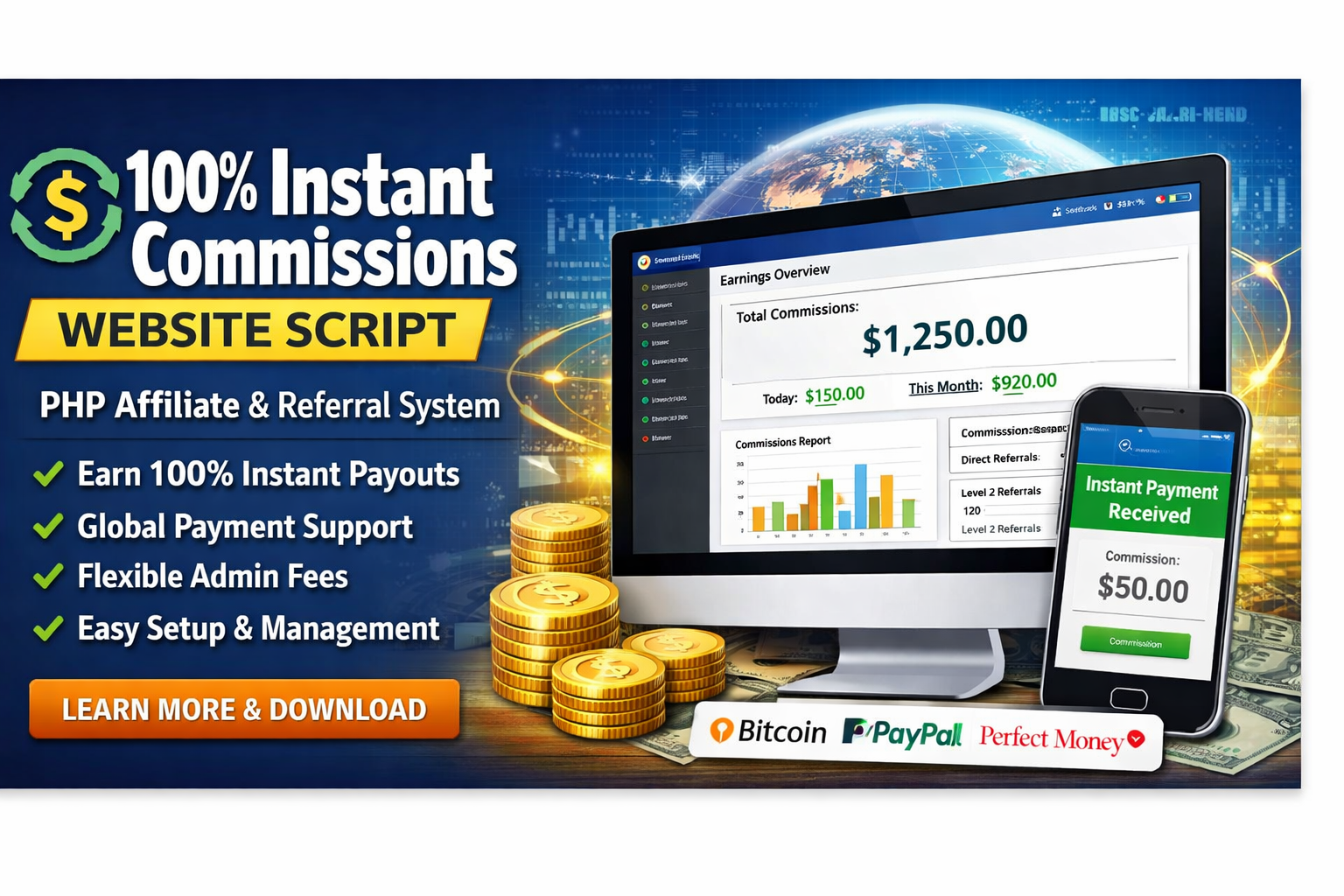 PHP affiliate/referral script where members get 100% instant commission payouts with global payment support and easy setup.