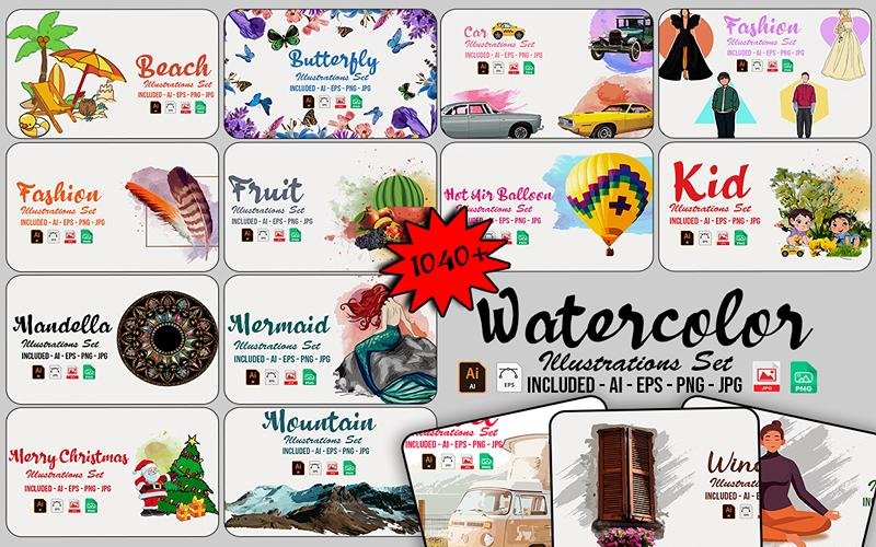Introducing 1040+ Beautiful Watercolor design Bundle. This Bundle consists of Watercolor Elements, Vector Elements, Illustrations, Objects, Patterns, and more.