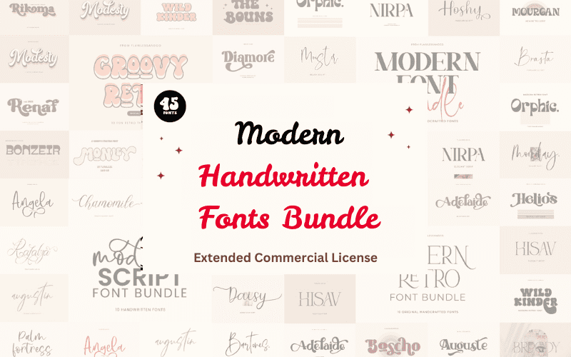 Instantly download this bundle of 45 modern handwritten fonts in OTF, TTF, WOFF, and WOFF2 formats. Extended license available at a discounted price.
