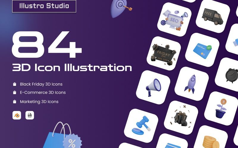 This bundle includes 84 illustrations of 3D Icons. These icons are divided across 3 categories – Black Friday Icons, E-Commerce Icons, and Marketing Icons.