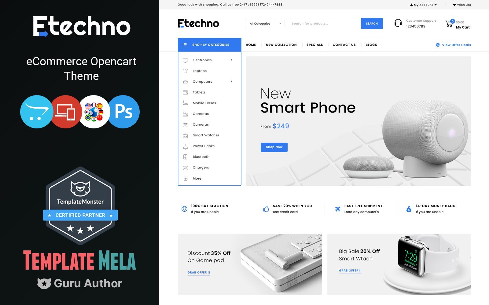 Etechno theme is professional responsive opencart theme built to create modern and powerful e-commerce website. Etechno opencart theme is seo optimized and friendly with most popular search engines. Etechno theme configuration gives the control with flexible settings, fast loading, fast support and much more. Etechno theme included OneClick (Quickstart) Package to get a replication of our theme demo store and installed on your website with same as our demo content, graphics, theme settings & layouts etc.