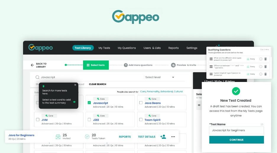 Traditional CVs and job portals just don’t cut it anymore. It’s time to embrace a more advanced and unbiased approach to hiring. Introducing – Gappeo – Talent & Skills Assessment Platform.Gappeo is a game-changing skills-assessment platform redefining how you hire and nurture your dream team.This talent and skills assessment tool is designed to help you hire the best talent based on the roles and skills you need. Gappeo not only helps with hiring the best talent but also helps with on-the-job skills growth to make the rockstar team for success. Get Gappeo today and enter a new era of unbiased and growth-driven hiring!Introduction to Gappeo – Talent Assessment Platform:https://www.youtube.com/watch?v=5JxWMPGA6iY&list=TLGGDAhnYj1VvhYyNTA3MjAyMw&t=8sFeatures of Gappeo – HR Hiring Software:500 Quality skill tests:Provides access to over 500 quality skill tests and invites candidates to access their skills.Custom Assessment:Allows you to customize and create your own assessments. Mix multiple skills to create one test.Skill-Based Assessment:Provides Job role or skill-based assessmentsAdd Custom Questions:Allows you to add qualifying and additional questions.Invite Users:Allows you to invite users with one click with the capability to bulk upload or generate assessment links.Hiring Assessment Tool Report:Provides one-click assessment reports for each candidate.Assessment TypesAllows you to conduct assessments in MCQs, Essay Questions, True/False, and Images, (In development – File upload, Video Questions, Audio Questions, Coding Questions).Anti-Cheat Capabilities:Provides strong anti-cheat capabilities with Screen Locking and Recording.Target Audience of Gappeo – Candidate Assessment Software:C-SuiteHiring TeamsHR TeamConsultantsBusinesses of all sizesPreview of Gappeo – HR Hiring Software: