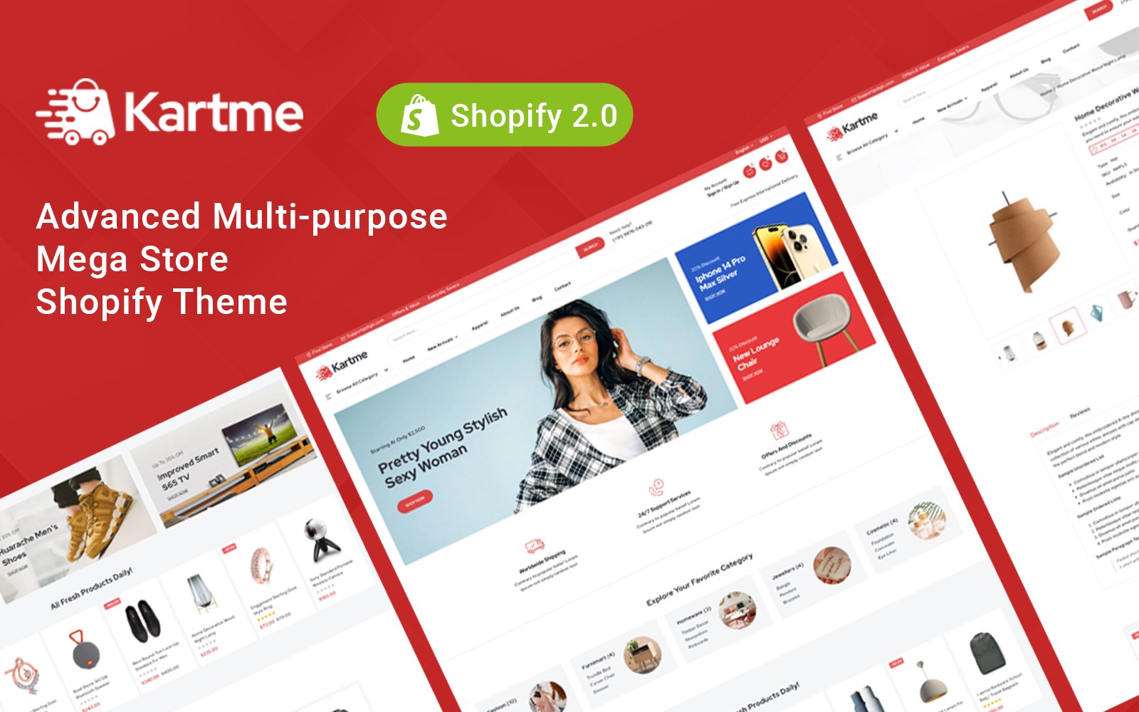 Kartme advanced multi-purpose mega store shopify theme is designed for selling eCommerce products online in specialty categories such as Fashion, Cloths, Apparel, Furniture, Electronics, Tools, Mobile, Gadgets, Megastore, Supermarket, Auto parts, Grocery, and multi-purpose businesses. This eye-catching Shopify theme has a wonderful clean and fluid design.
