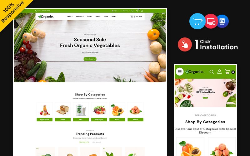 Organio – fruits and vegetables Opencart store is designed with unique layouts with its perfect color-combinations, full-width Homeslider with smooth animation text effect. Organio is particularly created for dairy products, ice cream, natural or organic food vegetables, bio-products, fruits, grocery, food, herbal store, furniture, fashion, outfits, fresh-market, plant & nursery, garden & tools, and many more. Organio looks very professional with full-width video. We are assured that it will meet all of your requirements or demand!