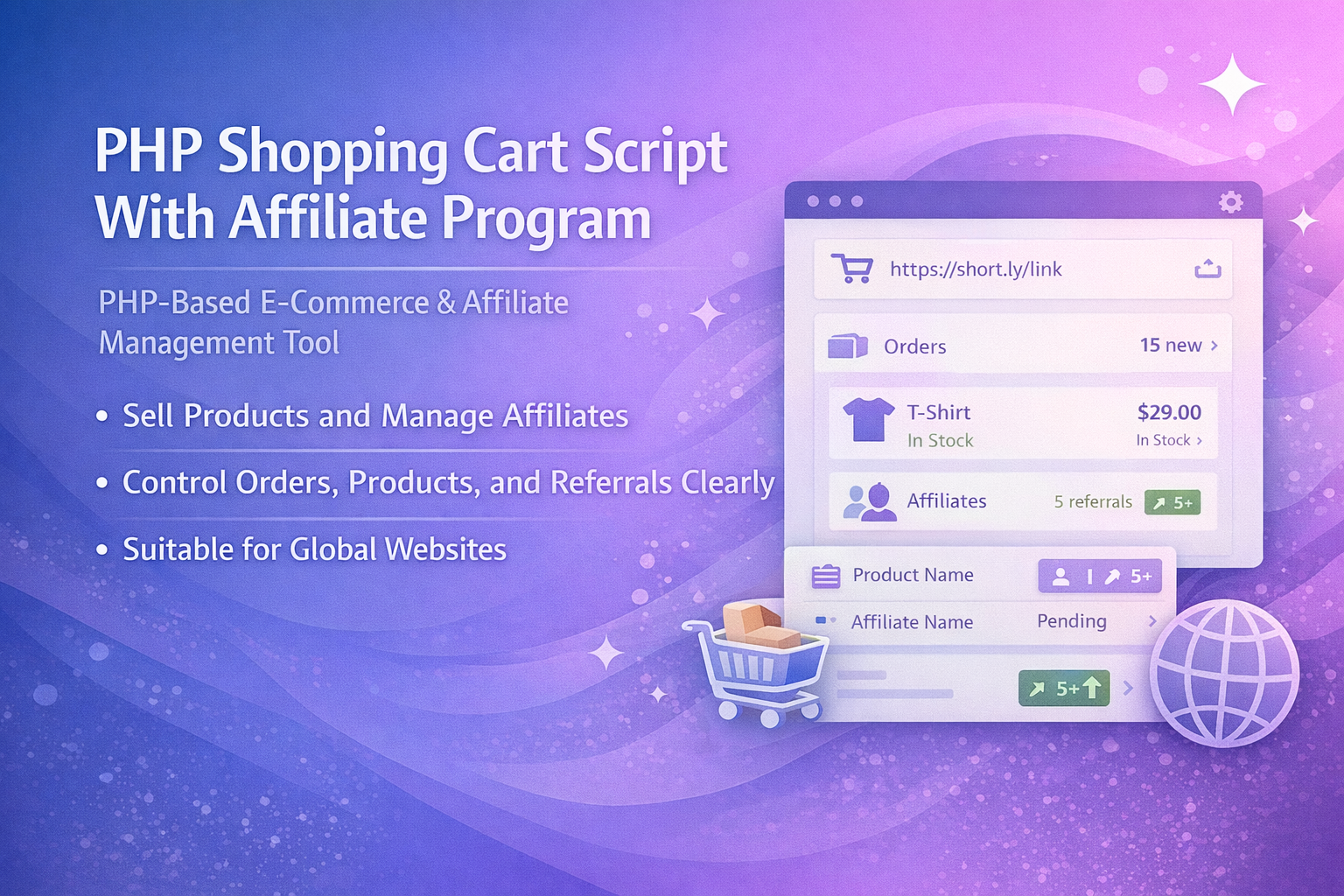 PHP Shopping Cart Script with built-in affiliate program, product search, and support for managing products.