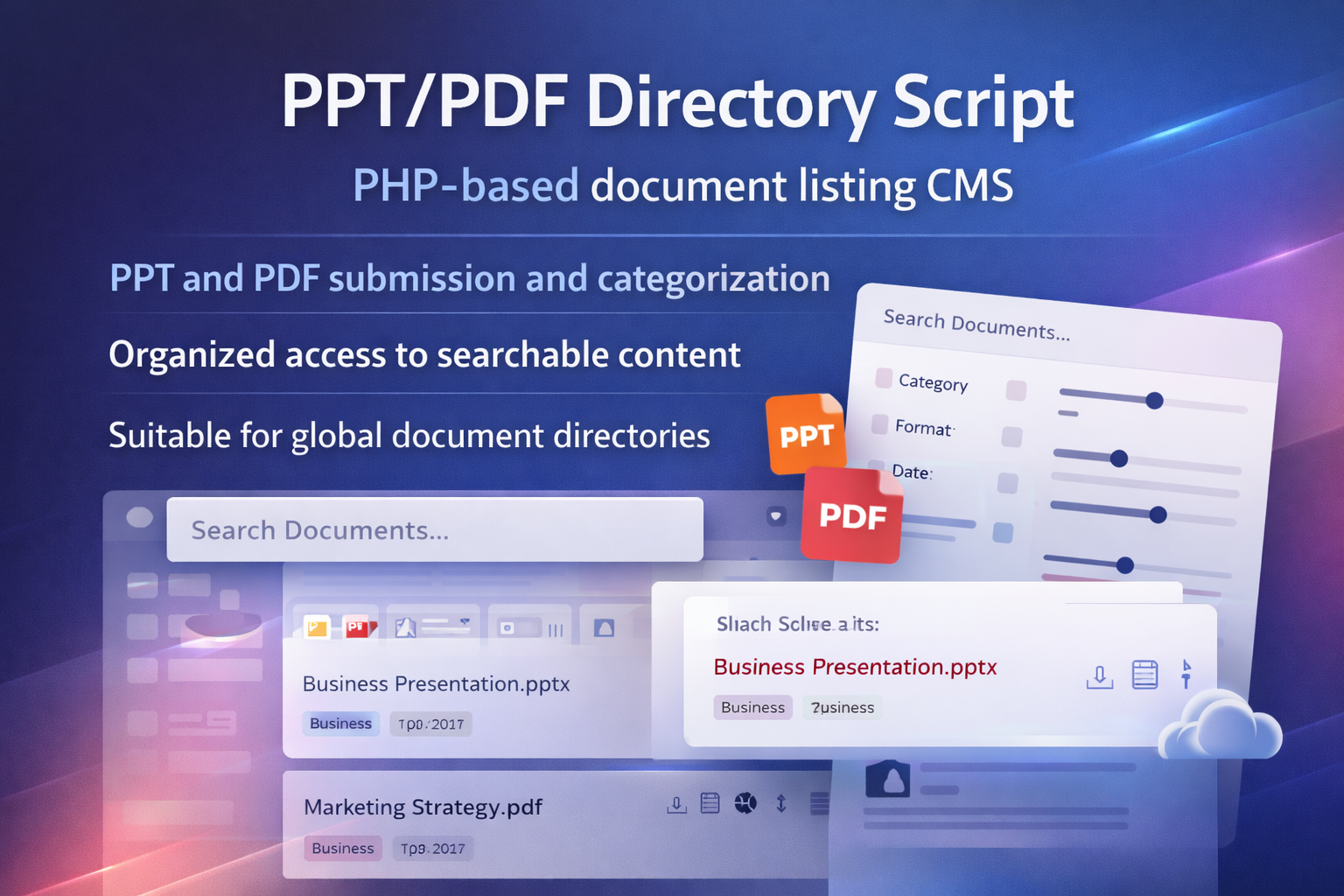 Build a PPT and PDF directory platform with user submissions, member levels, and customizable listings. PHP script for global content hubs.