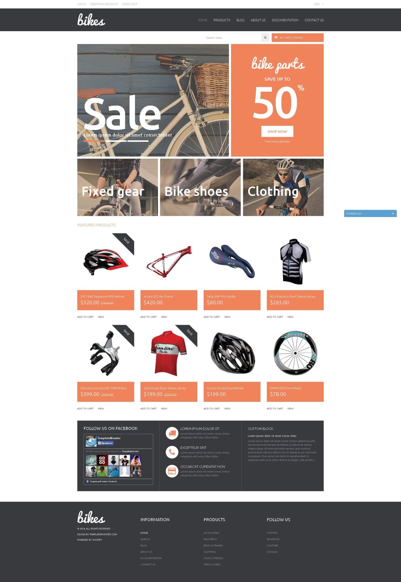 With the increase of green consciousness, it has become trendy to ride a bicycle. For many this is a fashion statement rather than a transportation method. No matter what goal you pursue, there should be a resource to shop bikes for any purpose. The given theme will help you with this. Its simple yet elegant palette featuring light and dark grey hues combined with vibrant orange elements will give a modern touch to your website. The design may not be as inspirational as others we offer, but it’s clever organization, user friendliness and intuitive navigation get the job done. One thing is certain the design perfectly serves its purpose of promoting and selling bikes and accessories online. You can find out more about this and other templates in our chart of Best Shopify Themes 2014.